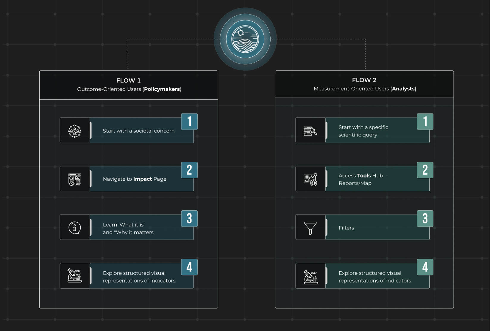 The platform introduces a structured approach to exploring ocean data, connecting high-level concerns with detailed scientific indicators.